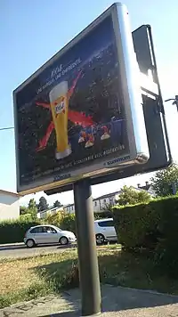 A grounded advertising billboard, supported by a trunk, lit by transmission, animated with winding posters, two sides, installed on public domain. Very common type of advertising device. |