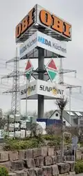 A mast, with billboards on one or more levels, aligned in 3 directions. The billboards are attached to the mast or a cantilever. The mast can be on private or public land. The billboards can be seen from a very long distance. Due to the height of the mast and the size of the panels, the tower can serve as a guide when approaching the shopping park. |