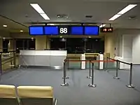 | The bounded space, inside the airport terminal, where passengers wait before boarding their flight |