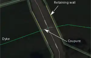 In the image below, an example of a coupure in a dyke is illustrated. The sides of the dyke opening are brick retaining walls. The coupure is both tagged as a way and node where the node is placed at the intersection with the road.