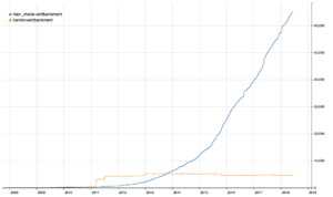 Graph of usage of man_made=embankment vs barrier=embankment from 2010 to 2018