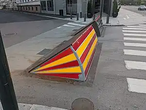 A wedge barrier (also called a rising kerb or hydraulic road barricade) is a kind of retractable barrier, shaped like a wedge or flap, that is level with the road surface until it automatically rises out of the ground to physically block all traffic from passing through. Wedge barriers are typically installed at checkpoints (military=checkpoint, police=checkpoint) and other high-security locations.