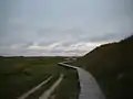 boardwalk or plank walkway over wet or otherwise difficult terrain, usually low to the ground and supported by posts.