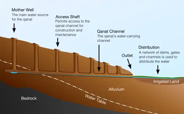 A qanat is usually built with vertical ventilation shafts along it's course, which can be used to verify the route of the underground waterway. These have been mapped as nodes with the tag excavation=qanat_shaft