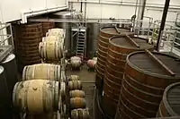 Winery is a building or property that produces wine, or a business involved in the production of wine, such as a wine company. Some wine companies own many wineries. Besides wine making equipment, larger wineries may also feature warehouses, bottling lines, laboratories, and large expanses of tanks known as tank farms.