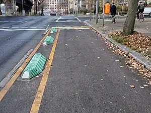 A buffered cycle lane is separated from the car lanes with extra space. This is still tagged as cycleway=lane but with cycleway:buffer=* added. For more specific tagging, the cycleway:left:buffer=*, cycleway:right:buffer=*, or cycleway:both:buffer=* variants can also be used.