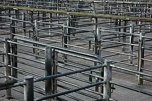 | An area used to temporarily hold livestock, generally with many fences. |