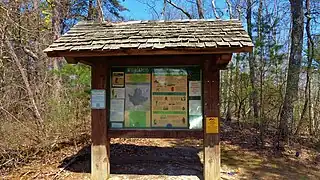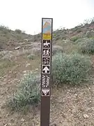 A trailhead is a designated or customary place where people can stop or start a trip on one or more trails or routes. Its position may be marked by a shelter, pole, special design, flag, banner, or parking area. Often there will be a board with a name and a reference to an operator. Parking space will usually be available. Some trailheads are unmarked and known only by word-of-mouth or from information provided on a list or website.
