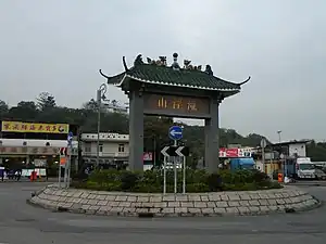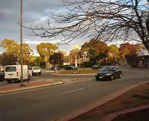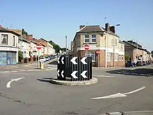 | A road junction where the traffic goes around a non-traversable island and has right of way. |