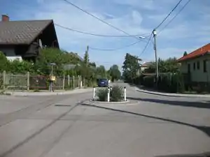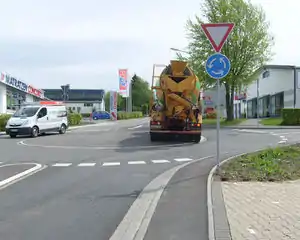 This photo shows a round place with a traversable island in the middle, but this is neither a mini-roundabout nor a roundabout, but instead a turning circle, which allows large vehicles to turn around. Please bear in mind that a turning circle can have any shape, but never a non-traversable island. |