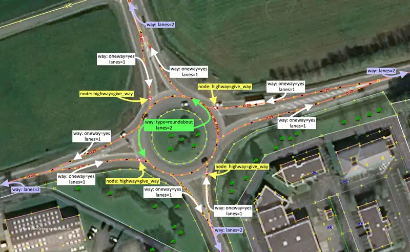 - It may be useful to tag the number of lanes=* in the ring (typically 2, where long vehicles will need to use both; 1-lane roundabouts are especially important to tag if they exist for large, but usually roundabouts the second lane, or are transformed to miniroundabouts whose central island is not blocking but can be used at very slow speed by long vehicles).
