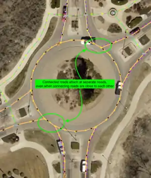 - Do not directly connect approaching with departing roads. Each way which intersects with the roundabout should be connected to it with a separate node. Two ways which enter and exit a roundabout should never connect to the same node on the roundabout. This is required to allow routing applications and software to provide correct directions, otherwise the routing software will not correctly recognise the roundabout. With a segment of the roundabout between the entrance and exit, routers can safely recognise that a section of the roundabout has to be driven through.