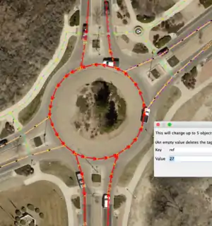 - Select two or three nodes (e.g. ending nodes of ways leading to a roundabout) and press 'shift-o' or select Tools -> Create Circle in the menu