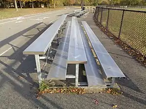 Benches range from simple plank benches to more elaborate benches with backrests. Many bleachers are open to the ground below so that there are only the planks to sit and walk on. Some bleachers have vertical panels beneath the benches, either partially or completely blocking the way to the ground.