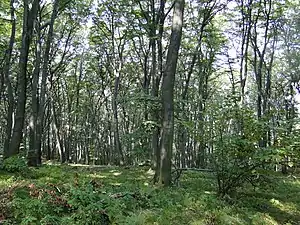 Forest within a city. This is not a park, as greenery is not fully controlled. This is a typical actively managed European forest, as leaves are not removed, trees are not cut into desired shapes, flowers are not planted but rather are growing naturally, etc.. (Las Wolski in Kraków, Poland)