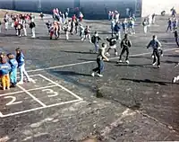 Besides dedicated playgrounds or sports pitches separate from the schoolyard (as indicated in the drawing above), some schoolyards may have painted markings or installations on themselves for various recess activities.