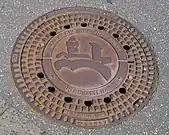 A circular drain with decorative emblem in the center, only small perforations. | |