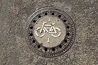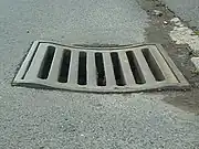 A drain located in the street in Germany. Also with only small perforations. The bicycle emblem may signify that this style of drain is designed to be more bicycle friendly, lacking the "large slot" style that can catch thinner bicycle tires. |