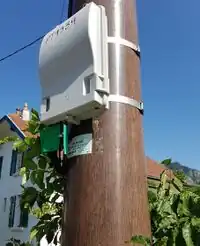 A shiny effect due to coating wouldn't have been visible with an actual wooden pole. It isn't possible nail anything in such a composite pole unless planned during molding, thus many equipment are attached with collars.