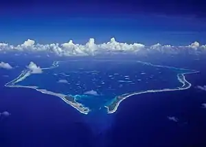 | A ring-shaped coral reef ithat encircles a lagoon partially or completely, and may include small islands. |