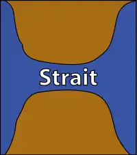 A strait is a narrow area of water surrounded by land on two sides and by water on two other sides forming a connection between those bodies of water. Typical cases include passages between islands or connections of bays and gulfs to the open ocean. Straits are significant and often named features as either sea travel routes, for water exchange or as fish migration routes.