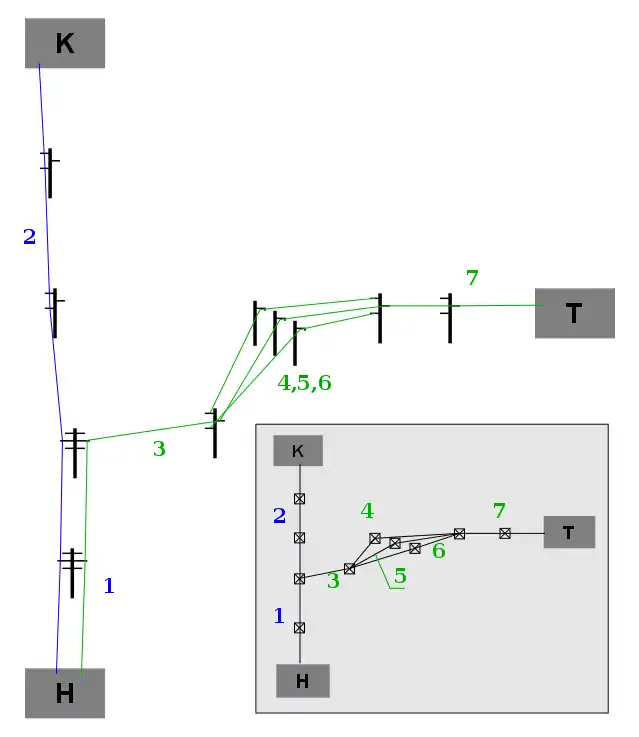 At the substation "H" both of the circuits run on the same towers (line segment 1), then split (the segments 2 and 3). Then the phases of the circuit "H—T" split (4,5,6) and then gather together again (line 7).