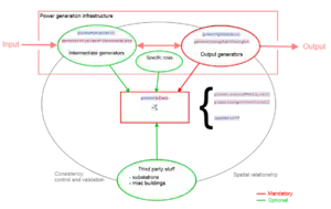 A 34 ha solar farm producing 24 MW of electricity when sun comes up in south of France. With a little aerial imagery help, generators are taken as groups of solar cells for sake of simplicity. It is actually possible to use The relation accepts two closed and fenced perimeters, all generators and a transmission substation connecting to the power grid |