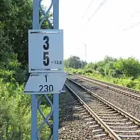 | A stone or metal marker along a railway denoting the distance traveled. |