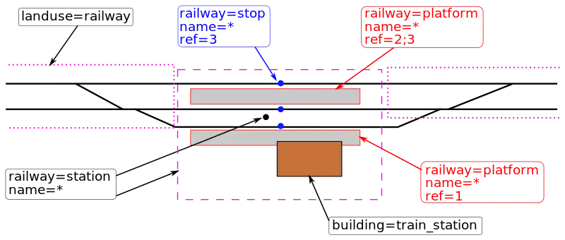 - ↑ https://taginfo.openstreetmap.org/tags/railway=station - more than 90k uses, public_transport=station has about 40k uses when used in meaning "railway station" - see https://taginfo.openstreetmap.org/tags/public_transport=station#combinations