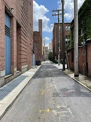 Alley streets are a road classification found in Baltimore, Maryland, USA[1], and potentially other places. Alley streets are alleys by definition, i.e., they serve the rear of buildings, but are named. Most named alley streets have addresses assigned to them, often small homes or carriage-houses that have been converted into homes, due to Next Generation 911 (NG911) standards that require local governments to sign any public street with addresses. Alley streets may have sidewalks but they are small and designed to house trash cans or steps down from homes. Alley streets do not typically have on-street parking, which distinguishes them from residential streets.