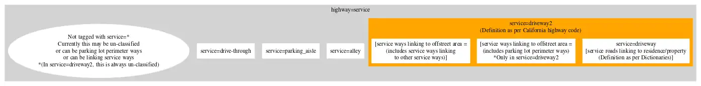 - This is in contrast to service=driveway2 proposal. If the user does not have the time to classify the minor ways, the user just applies highway=service and leaves the classification to a later stage. If the user does classify the way or returns at a later time to classify the way, the user can simply check through the service=parking_aisle, service=drive-through and service=alley tags to determine if it is one of the preceding tags. Otherwise, the way can be classified as service=driveway2 (not any of the preceding).