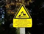 France | A pole sign warning about the presence of a buried high voltage power cable in French country. |