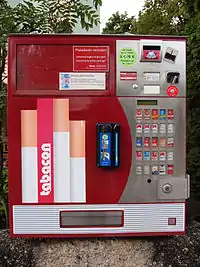 | A cigarette machine is a vending machine that dispenses packets of cigarettes. |