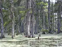 | An area of waterlogged forest, with dense vegetation. |