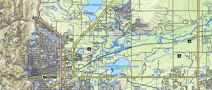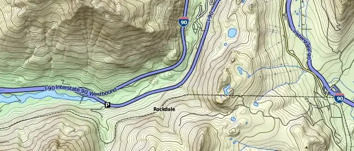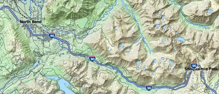 Hillshading and contour lines are derived from the 1/3 arc-second National Elevation Dataset from USGS. The hillshading layer is color-coded with a typical green/brown/white gradient by elevation. Additionally, on higher zoom levels, contour lines are available with 50 ft intervals with a major contour line every 250 ft. Contour lines are marked with elevation labels, in feet.