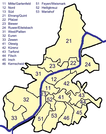 Die 28 Stadtbezirke heißen: Nells Ländchen, Maximin, Altstadt, Barbara, Matthias, Ehrang, Quint, Pfalzel, Ruwer, Eitelsbach, Biewer, Pallien, Trier-West, Euren, Zewen, Alt-Kürenz, Neu-Kürenz, Gartenfeld, Olewig, Tarforst, Filsch, Irsch, Kernscheid, Alt-Heiligkreuz, Neu-Heiligkreuz, Mariahof, Weismark, Feyen;