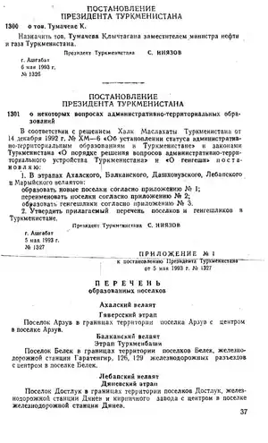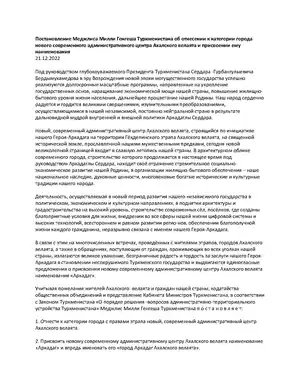 - Постановление Меджлиса Милли Генгеша Туркменистана об отнесении к категории города нового современного административного центра Ахалского велаята и присвоении ему наименования 20 December 2022