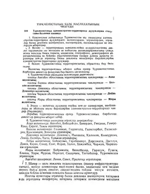 - ↑ Many Turkmen governance terms are calques of Arabic or Persian words. For example, welaýat derives from the Arabic ولايَة (wilāyat), meaning state or province; şäher derives from the Persian شهر (šahr), meaning "city, town", and is a cognate of the Turkish şehir. Such loan words were apparently more politically palatable after independence than Russian-origin calques.
