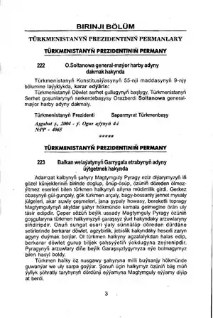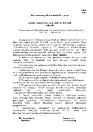 - ↑ “Постановление Меджлиса Милли Генгеша Туркменистана об отнесении к категории города нового современного административного центра Ахалского велаята и присвоении ему наименования” (in ru). Электронная газета «Золотой век». 21 December 2022.