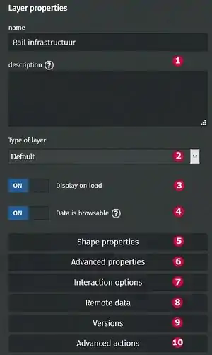 Defaults on layer level for object label and object popup. See Configure shape interaction (labels…) for details.