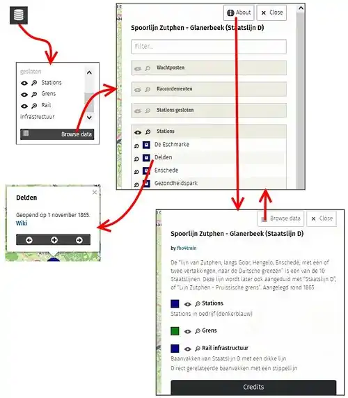 Click Browse data opens a panel on the right side which allows to browse the objects of all layers. The objects will show a pop-up. There is also a button to show information about the map itself and the layer descriptions. The picture shows globally how.