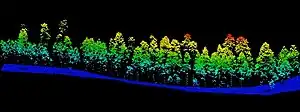 In collaboration with federal, state, and local partners such as the United States Forest Service and Federal Emergency Management Agency, the USGS 3DEP Program offers up to 50% cost-match for LiDAR data collections. To produce a digital elevation model, Light Distance And Ranging technology uses lasers from an aerial platform such as an airplane. Individual reflected light returns form a "point-cloud", usually classified into groupings of ground, vegetation, water, and building points. Point clouds, often stored in compressed .LAZ file format as tiles of a larger collection area, are available for download from the National Map Downloader(elevation source data) or online viewing using tools such as Cesium and Potree now made possible through the development of Entwine Point Tiles file format and collaboration, see [ https://usgs.entwine.io/].