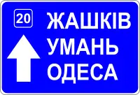 | Використовується для зазначення назви міста, до якого веде автомагістраль. |