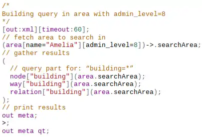 Tramite Overpass query (visualizzata a fianco, predisposta per i fabbricati del comune di Amelia) si farà il download dei buildings già inseriti in OSM per la corrispondente amministrazione comunale, quindi tramite il plugin Conflation e JOSM Validator si verificherà quali oggetti sono già presenti, mantenendo quello già presente, a meno di evidente geometria errata o non correttamente allineata.