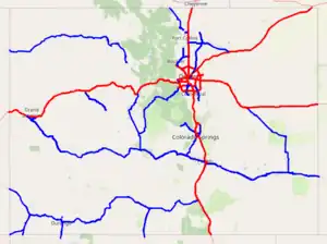 Example of trunk and motorway display from the Overpass query for the state of Colorado.