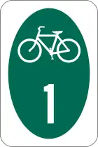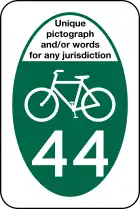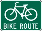 The older black and white M1-9 "numbered national bicycle route" sign shield (seen to the right and above) was MUTCD-approved from the 1970s through 2013. The newer green sign (seen to the right) is also M1-9 and will replace the black and white M1-9 in the next MUTCD edition. In the meantime states get waivers from FHWA to use the green sign. It is "interim official" and will become official on the next pass. It is AASHTO approved. The color change to green is to better differentiate it from other black and white route number signs and to align it with the color of Bike Route signs. The new sign also has the "US" imprint to show it is different from quasi-national, state and local level bike route signs (see below).