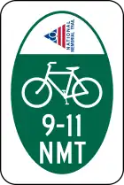 - 9-11 National Memorial Trail (9-11, 2684 km / 1648 miles long, shares several statewide segments of ECG, USBRs and Great Allegheny Passage) in Pennsylvania, Maryland, Virginia, Delaware, New Jersey, New York and the District of Columbia. "9-11 NMT" is defined as an alphanumeric acronym, not a number. Portions of this route are off-road trail (gravel, dirt, otherwise unpaved infrastructure). The September 11th National Memorial Trail uses an M1-8a bicycle route shield bearing the logo of the September 11th National Memorial Trail Alliance and
