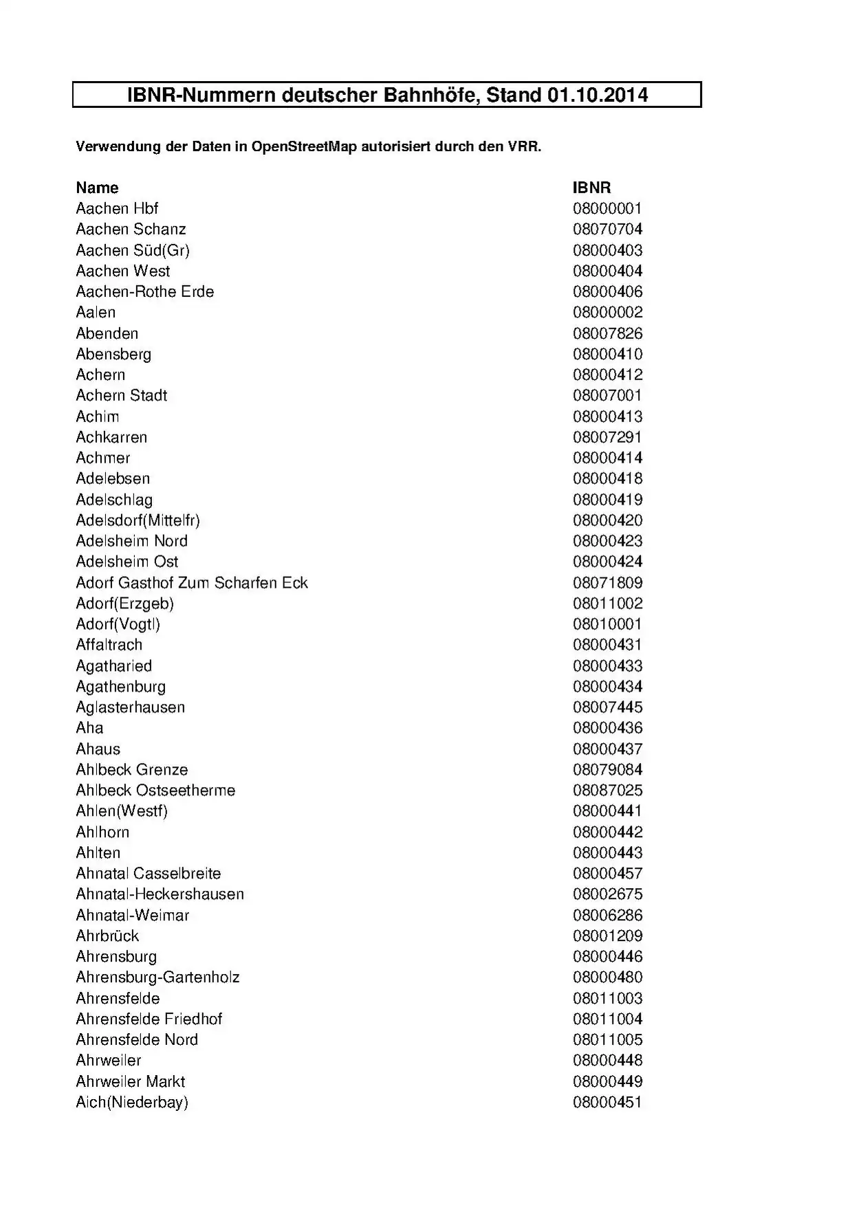 - Datei mit allen IBNR-Nummern deutscher Bahnhöfe, Stand 10/2014, Verwendung für OSM autorisiert vom VRR. Bitte beachten: Der VRR selbst nutzt zur eindeutigen Referenzierung all seiner Haltestellen die weltweit standardisierte IFOPT-Nr. (s. oben). Die als "uic_ref" zu taggende IBNR ist ein per Definition nur für Bahnhöfe geltender Standard, auch wenn im HAFAS-Auskunftssystem der DB auch "normale" Haltestellen über eine Nummer verfügen. Da es sich hier für "nicht Bahnhöfe" um ein proprietäre Numerierung in der HAFAS-Auskunft handelt, ist die Notwendigkeit einer Erfassung in OSM zu hinterfragen.