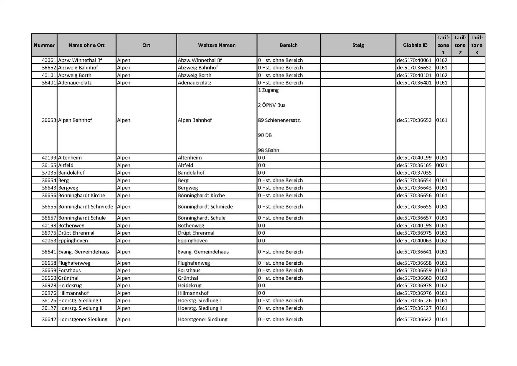 Diese enthält über 13.500 Haltestellen mit Bereichen, Steigen und Tarifzonen. Wenn gewünscht kann die "uic_ref" bei Bahnhaltestellen ebenfalls ausgewiesen werden.
