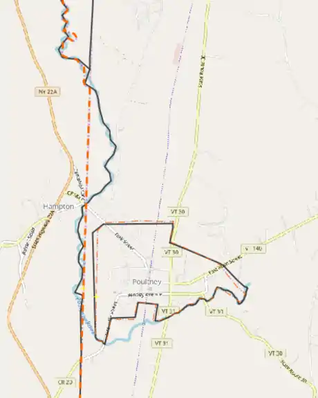 1. Near Poultney, VT and Hampton, NY, the Vermont data has the state border following the course of the Poultney River until east of Poutlney, wOhile OSM has the border leaving he river north of Poultney and beginning a straight cross-country line.